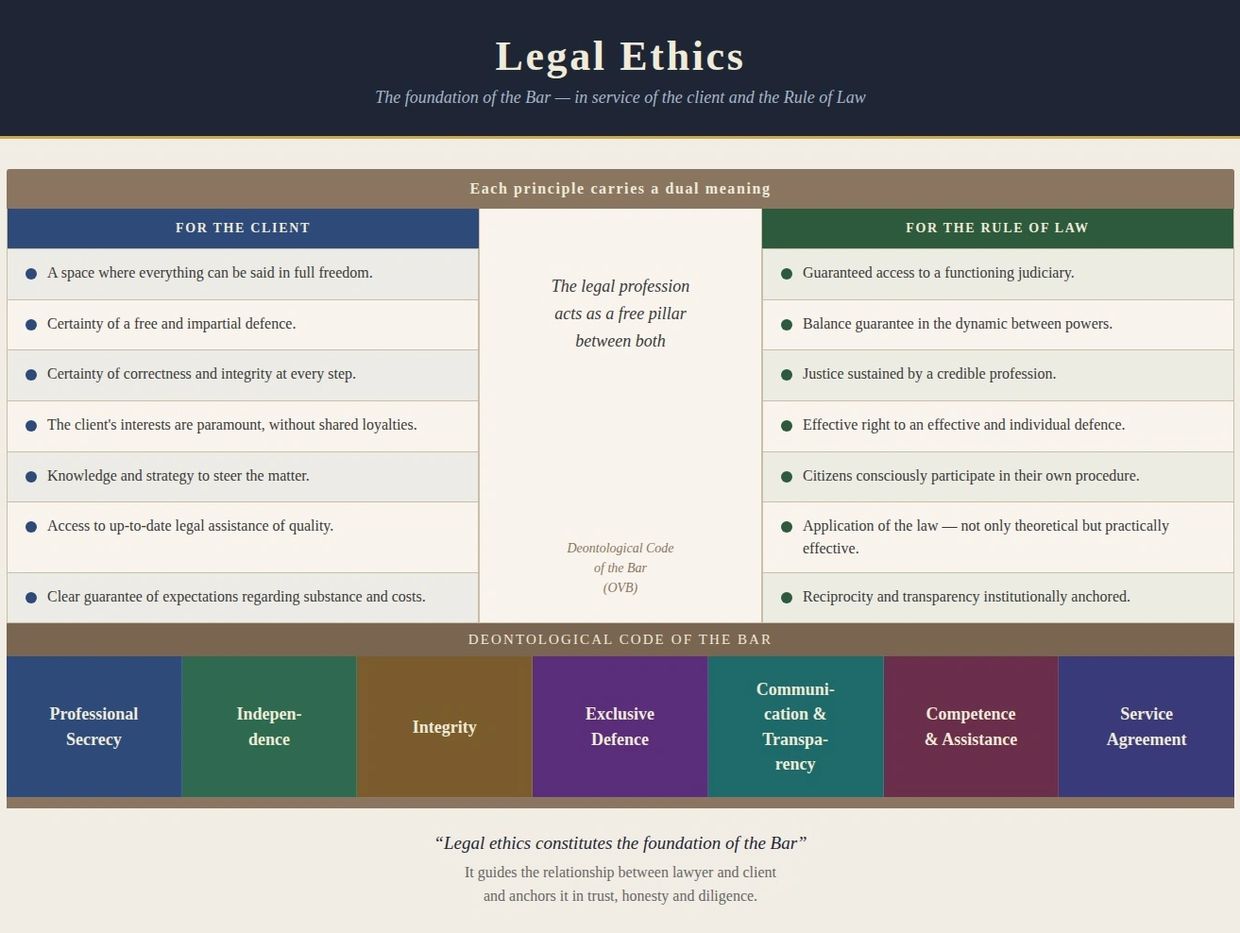 Legal ethics form the foundation of the legal profession. They guide the relationship between lawyer and client and anchor it in trust, honesty and diligence. The rules laid down in the Code of Professional Conduct for Lawyers are not merely professional regulations: they carry a dual significance. For the client, they constitute a guarantee of protection and reliability in the individual relationship. For the rule of law, they are structural conditions that ensure the legal profession can function as a free and credible pillar of justice.