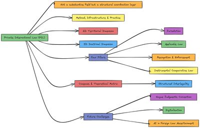Private international law, in the Penteract model, is not a substantive field but a structural layer of coordination. It is at once method, infrastructure, and practice. Its placement in the 2D territorial and 5D doctrinal dimensions reflects its dual character: both a practical compass and a theoretical matrix. By embedding jurisdiction, applicable law, recognition, and comparative law into a coherent framework, PIL ensures that cross-border adjudication is not a matter of chance, but a structured process of interlegality.